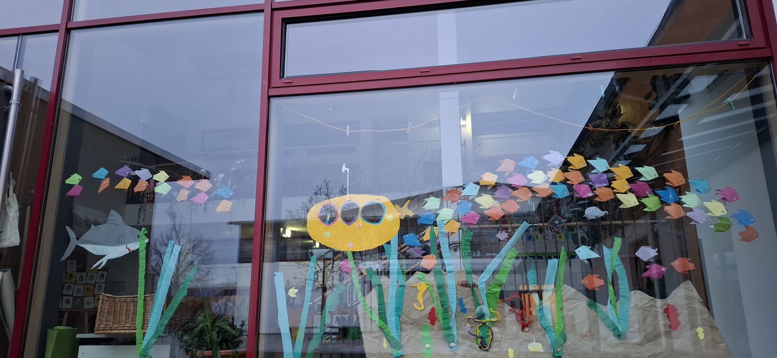 Mit Eifer wurde von der Bastelgruppe am Mittwoch das Schulhaus als Unterwasserwelt gestaltet. Nach einer Wanderung durch die Natur am Donnerstag folgte freitags der Abschluss mit Snowtuben am Kessellift in Inzell.